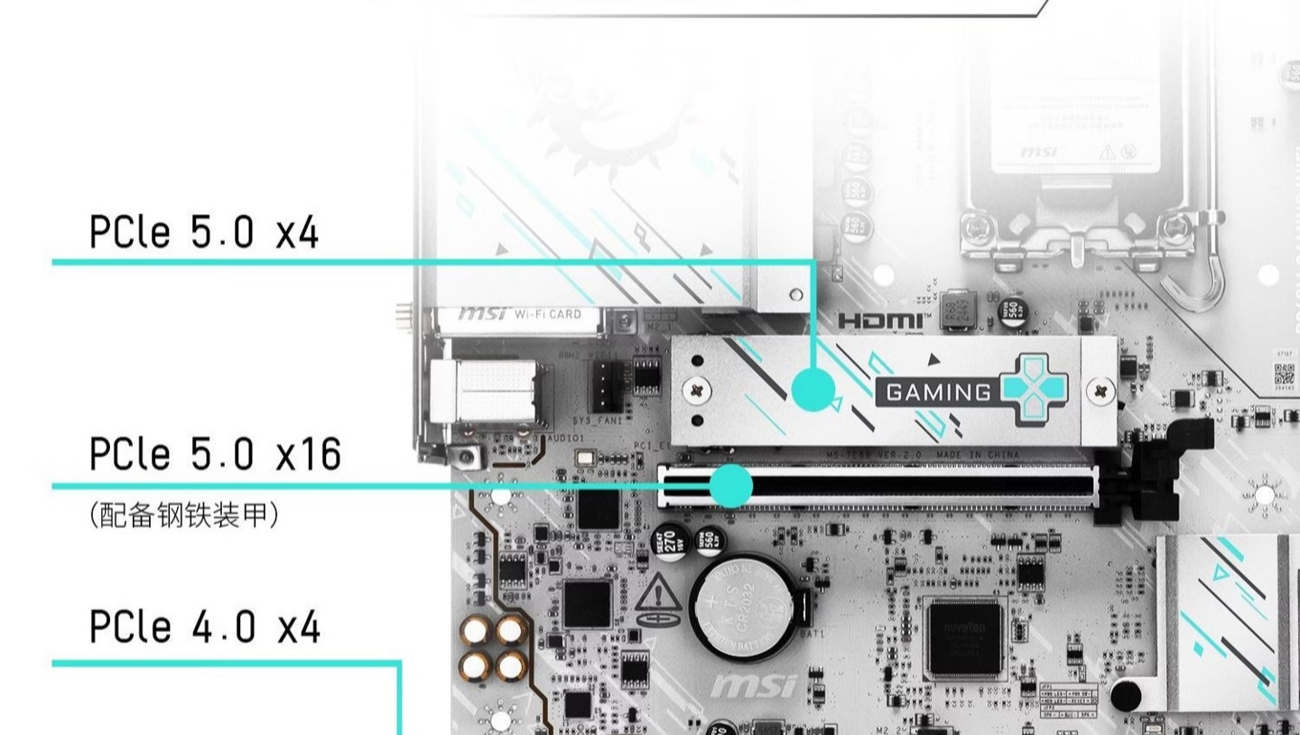 微星 B860M GAMING WIFI 主板采用了 2 插槽双通道内存,通过线路独立设计,降低阻抗并减少电路干扰,配合内存加速引擎。可支持 9066+MT/s 以上的 DDR5 内存速度。