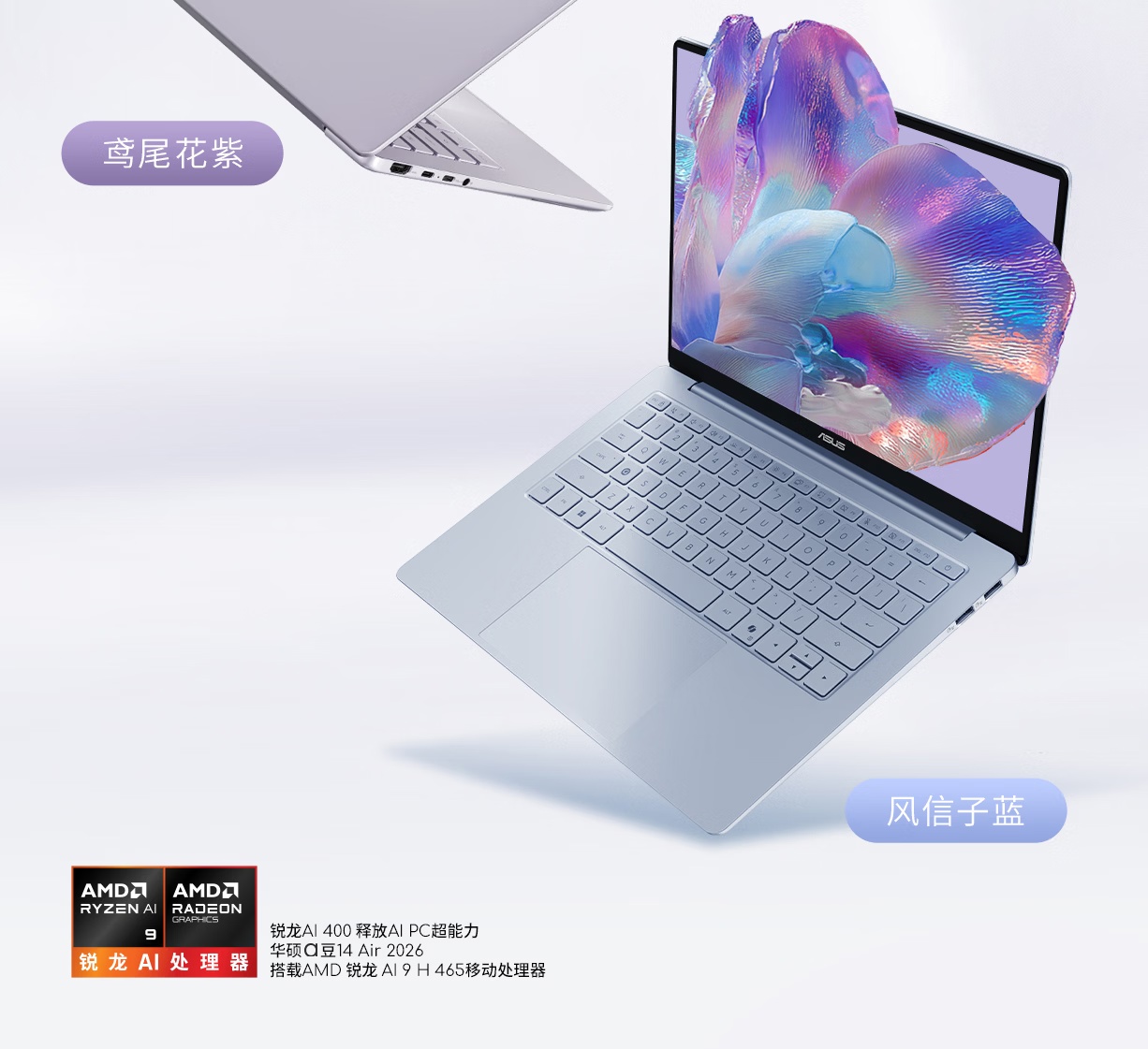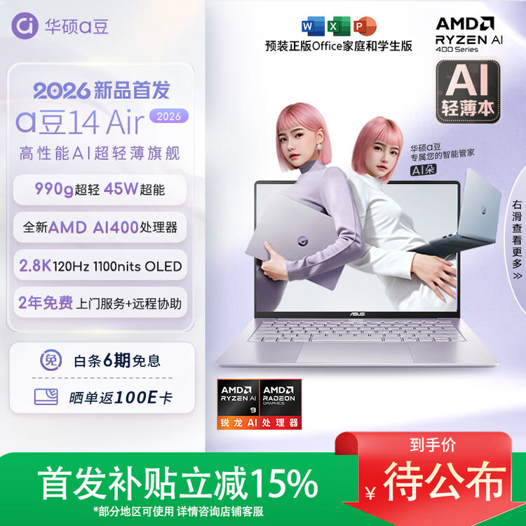 1 月 14 日消息,华硕 a 豆 14 Air 2026 超轻薄 AI 笔记本电脑现已上架预约,提供鸢尾花紫、风信子蓝两种配色,将于 1 月 22 日 20:00 上市。