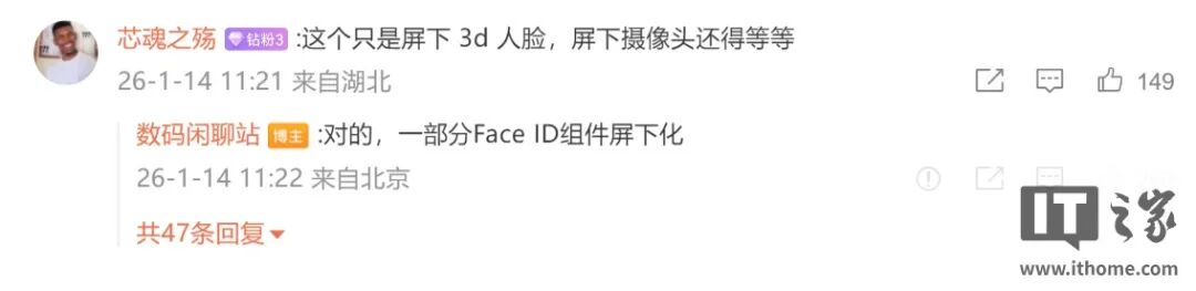 而这个“屏下”指的是 Face ID,而非前摄,博主在回复网友留言时明确说明是“一部分 Face ID 组件屏下化”。
