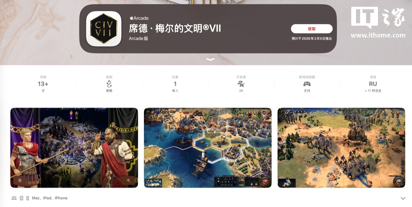 1 月 15 日消息,苹果宣布策略游戏《席德 · 梅尔的文明 VII(文明 7,Sid Meier's Civilization VII)》将于 2 月 5 日正式上线 Apple Arcade 订阅服务,支持 Mac(Apple 芯片)、、 平台,但不支持 Vision Pro。