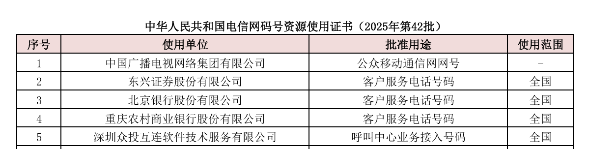 近期,工业和信息化部公布了 2025 年第 42 批次电信网码号资源。其中,中国广播电视网络集团有限公司新增了 1610 码号,信息显示:批准用途为“公众移动通信网网号”,使用地为“全国”。