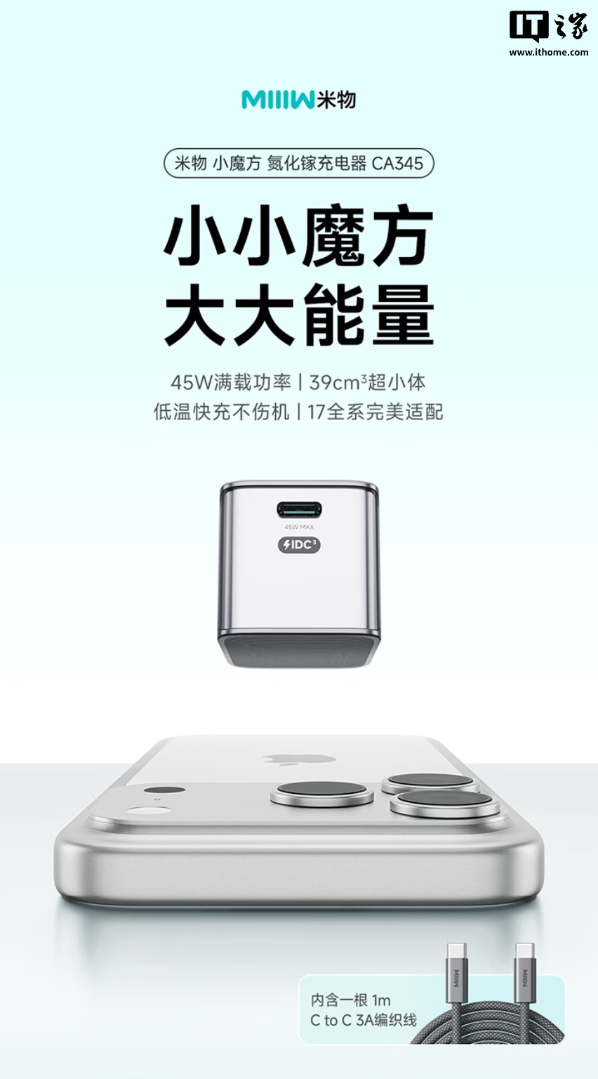 1 月 15 日消息,米物科技现已在京东上架小魔方 45W 氮化镓充电器,该产品提供单 USB-C 接口,附带 1 米长度 60W 充电线,定价为 69 元。