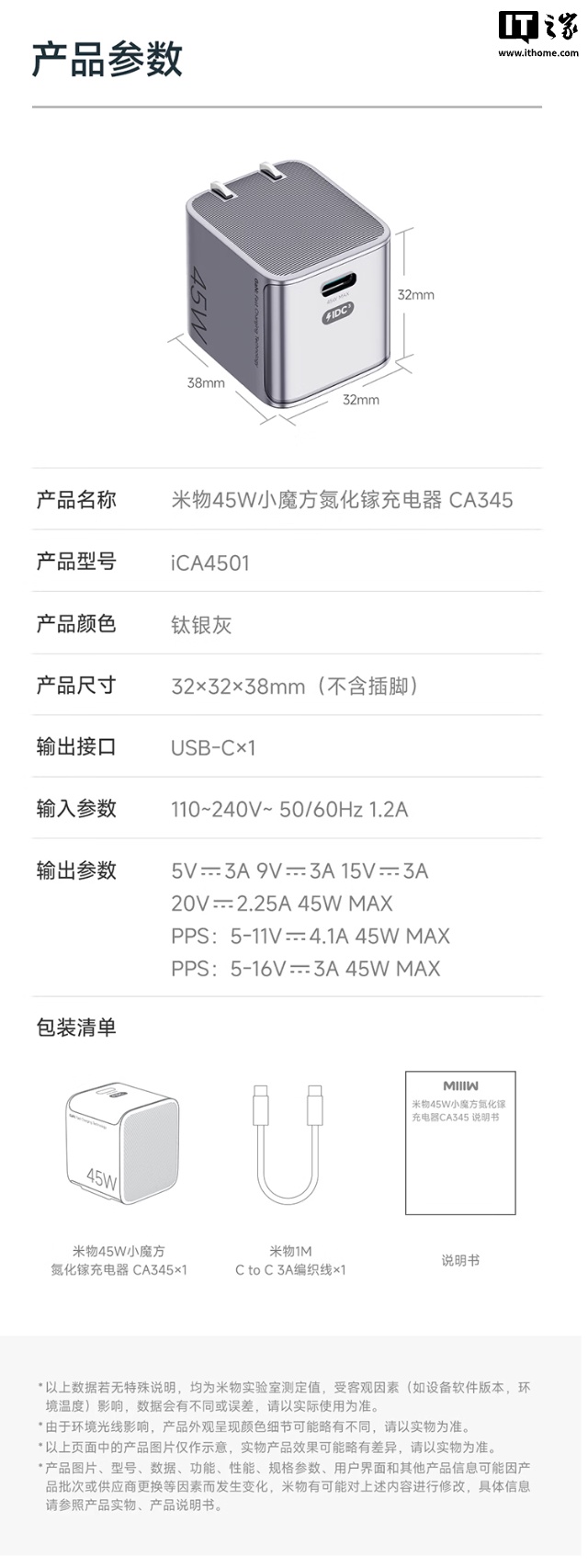 米物科技推出小魔方45W氮化镓充电器,单USB-C口支持小米澎湃秒充,兼容PD/SCP等协议,尺寸38x32x32mm,重64g,附带1米60W线,京东售价69元。#数码好物##充电器#