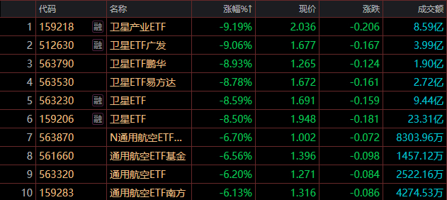 卫星产业ETF(159218)领跌9.19%,卫星ETF广发(512630)跌9.06%,卫星ETF鹏华(563790)跌8.93%。