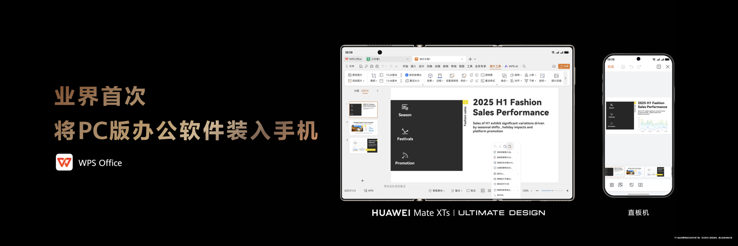 依托鸿蒙“一次开发,多端部署”的特性和多端互联能力,鸿蒙版 WPS 解决了传统办公软件在不同设备间功能割裂、体验断层的痛点。在折叠屏上,WPS 能像“折叠屏伴侣”一样,智能适配屏幕形态,自动提供最优化布局,将硬件创新真正转化为生产效率。在三折叠手机 Mate XTs 上,WPS 甚至实现了 PC 级多窗交互 —— 把桌面生产力装进口袋,这已不是优化,而是重新定义移动办公。