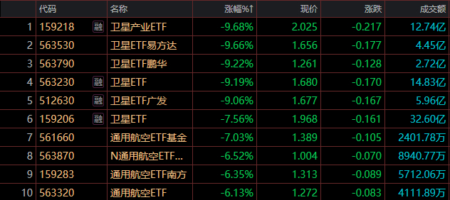 卫星产业ETF(159218)领跌9.68%,卫星ETF易方达(563530)跌9.66%,卫星ETF鹏华(563790)跌9.22%。