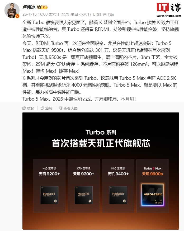 京东小米 REDMI Turbo 5 Max 首发天玑 9500s 芯片待发布直达链接据小米集团合伙人 / 总裁、手机部总裁、小米品牌总经理卢伟冰介绍,REDMI Turbo 5 Max 搭载天玑 9500s,综合跑分达 361 万。这是天玑正代旗舰芯首次来到 Turbo。