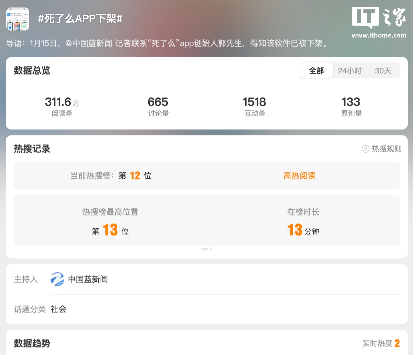 然而在一周后的今天,这款 App 突然从苹果 App Store 国区下架,截至发稿,相应话题在微博阅读量达 311.6 万,位于实时热度第二。