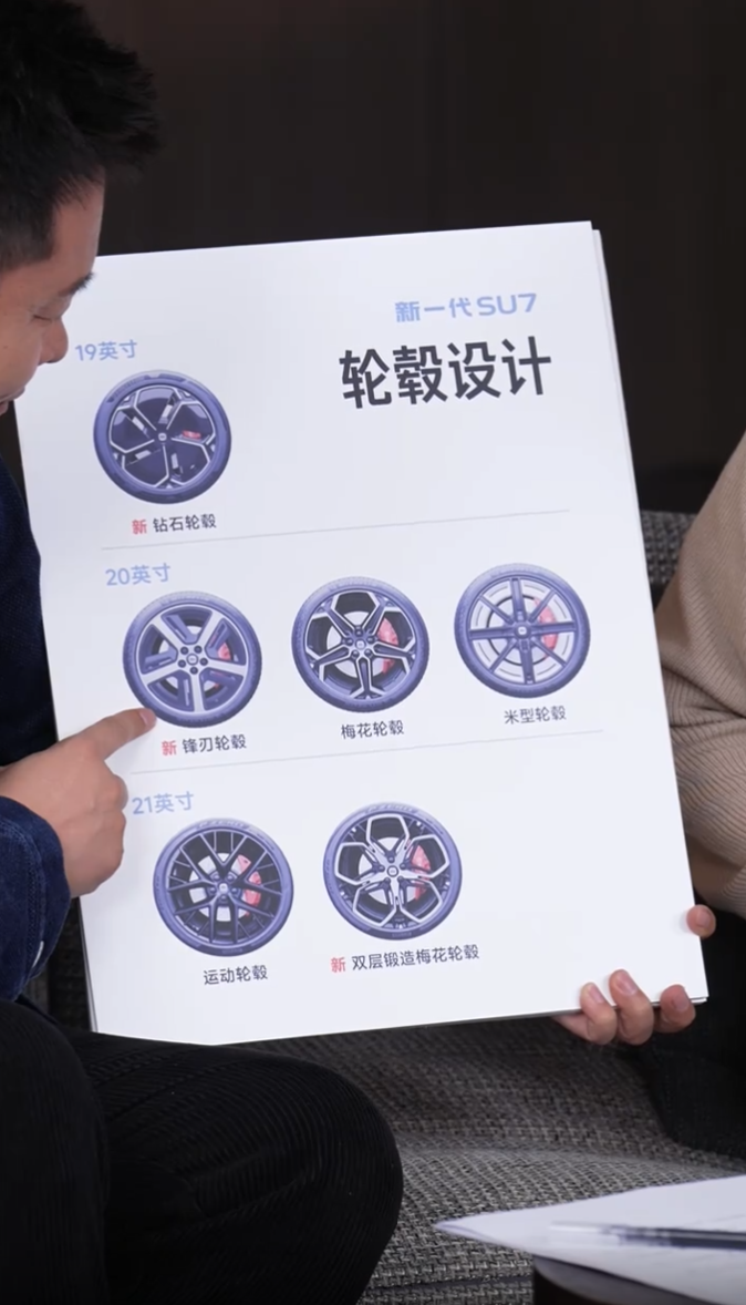 小米雷军直播公布新一代SU7轮毂设计,共6款可选,涵盖19-21英寸。新车全系标配激光雷达、700TOPS算力等,智能驾驶大幅升级,预售价22.99万起,预计4月上市。#小米SU7# #新能源汽车#