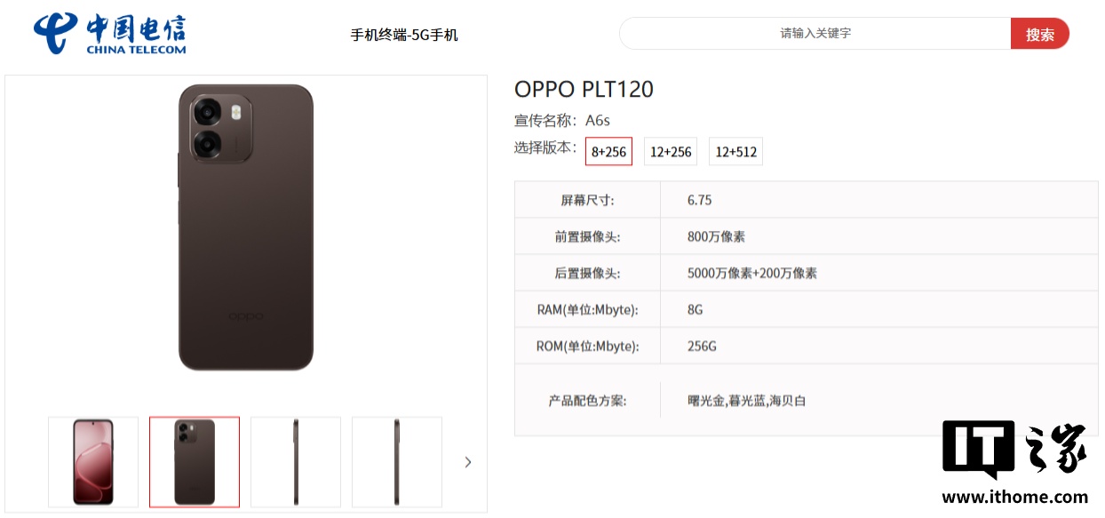 1 月 15 日消息,型号为“OPPO PLT120”的 OPPO A6s 目前已现身中国电信终端产品库,提供 8GB+256GB、12GB+256GB、12GB+512GB 三种存储规格,并提供曙光金、暮光蓝、海贝白三种配色,产品零售价格尚未公布。