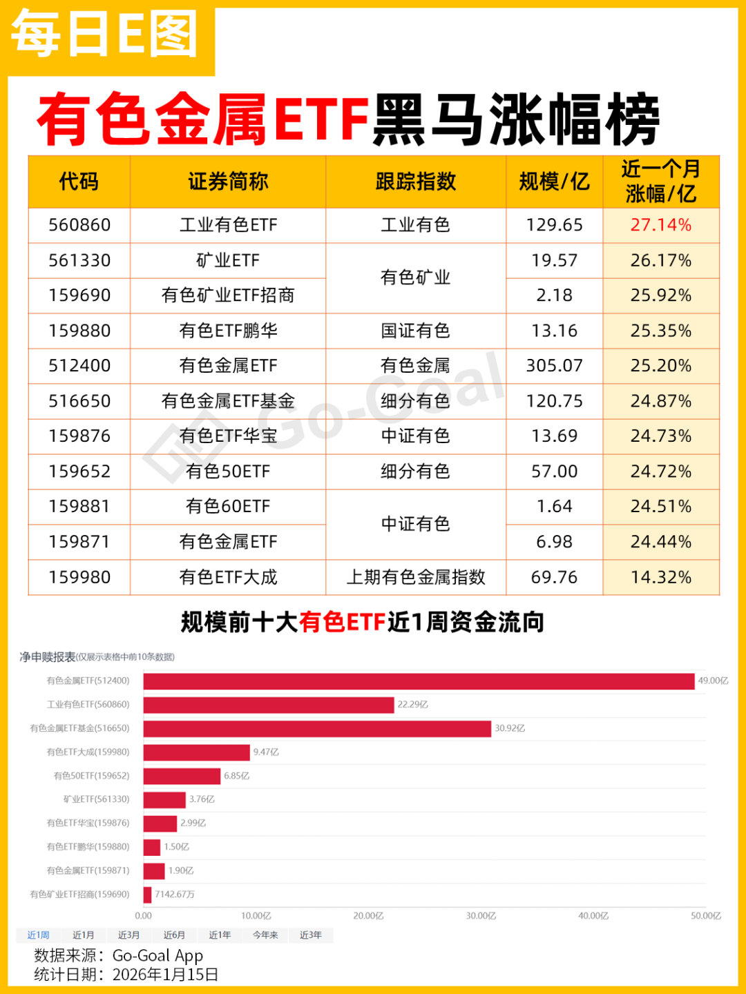 截至1.15,近一个月涨幅最高的是工业有色ETF(560860),近一个月涨幅27.14%