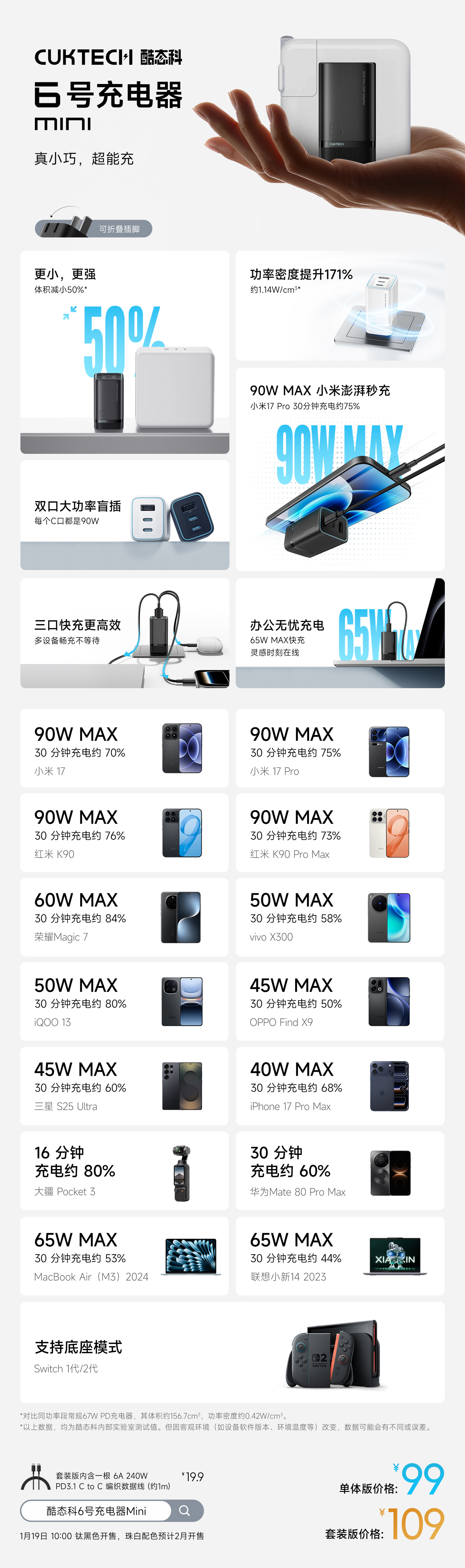 酷态科 6 号充电器 Mini 发布:支持小米 90W 秒充、ADC 2.0 自适应快充充电器酷态科
