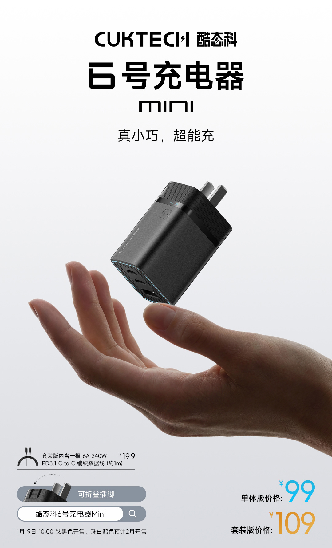 酷态科今天推出了全新的“小布丁”迭代产品 —— 酷态科 6 号 mini,单体版 99 元,套装 109 元,将于 1 月 19 日 10:00 开售(钛黑配色)。