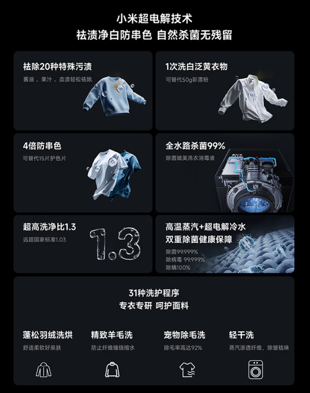 据介绍,这款新品支持 12kg 洗 +9kg 烘干大容量,具有 1.3 超高洗净比,小米超电解技术强效祛渍净白防串色,支持除菌 99.999%、除病毒 99.999%、除螨 100%。