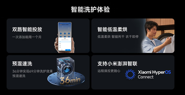 新品支持双路智能投放,智能感知衣物重量,精控洗衣液和柔顺剂投放量,减少化学残留,一次添加够用一个月。此外,该产品还支持预混速洗、12min 快速洗、智能低温柔烘、轻干洗等多项功能。