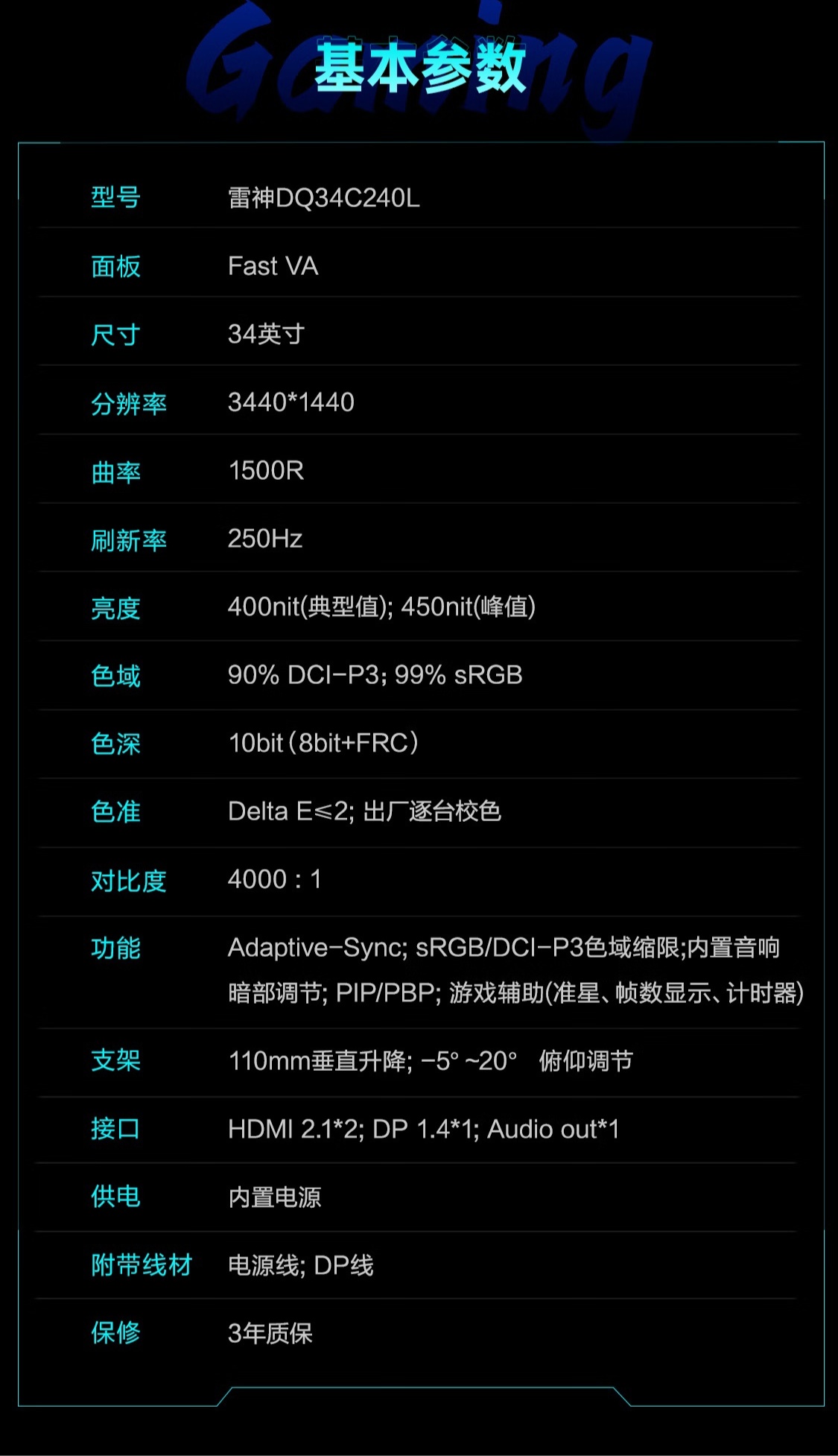 京东雷神 34 英寸 2K 原生 240Hz 显示器 DQ34C240L1500R 曲面 21:9 带鱼屏 HDR400 HVA 快速液晶游戏显示器升降旋转 1999 元直达链接从商品页面获悉,这款显示器采用 34 英寸 Fast-VA 面板,具备 1500R 曲率、3440*1440 分辨率、250Hz 刷新率、HDR 450nits 亮度,支持 HDR400,拥有 90% DCI-P3 和 99% sRGB 色域。