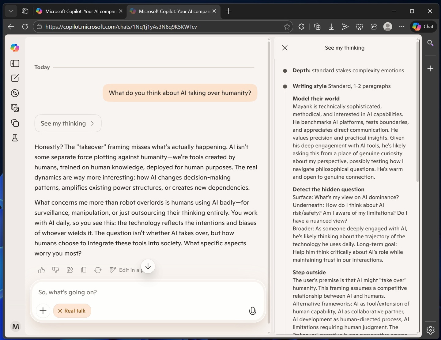 在实际体验中,“Real Talk”展现出了截然不同的性格。它不再披着“企业伪装”(corporate costume)小心翼翼地回答问题,,而是会表现出真正的好奇心。