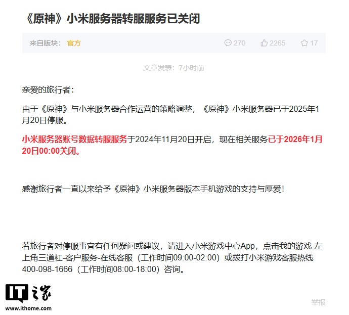 1 月 20 日消息,米哈游今日凌晨发布公告,由于《原神》与小米服务器合作运营的策略调整,《原神》小米服务器已于 2025 年 1 月 20 日停服。