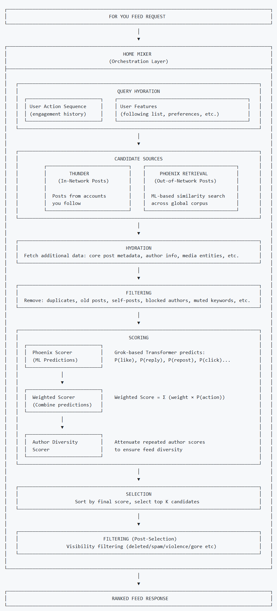 X 平台已开源 For You 推荐算法,该算法与当前运行的生产系统相同,并由 xAI 的 Grok 提供支持。完整代码已发布在 GitHub 上,并将每 4 周更新一次。