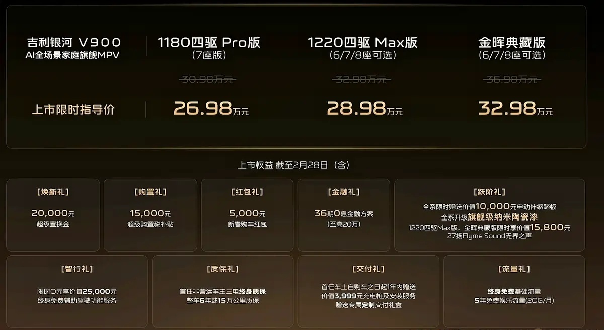 1 月 20 日消息,吉利银河旗下全新中大型 MPV 银河 V900 正式上市,共推出 3 款配置,官方售价区间为 30.98-36.98 万元,上市限时指导售价为 26.98-32.98 万。此外,官方还为前 3000 名提车用户(金晖典藏版)准备了 10 克纯金的特别礼遇。