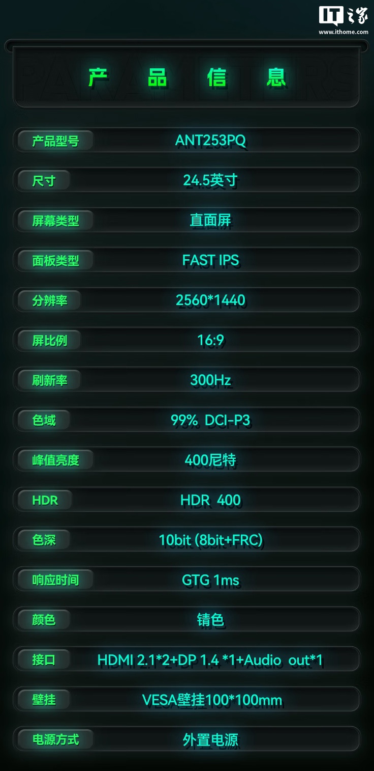 1 月 20 日消息,HKC 旗下蚂蚁电竞现已推出一款“ANT253PQ-N”24.5 英寸显示器,这款显示器系《永劫无间》联名版本,主打“2K 300Hz”,首发价为 1799 元。