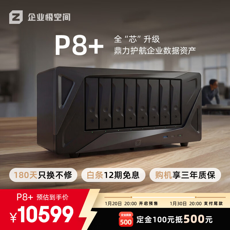 1 月 21 日消息,极空间私有云新推出了一款八盘位的 NAS 网络存储服务器 —— 极空间 P8+,标配双冗余电源 + 内置 UPS 模组无惧断电,首发价 10599 元。