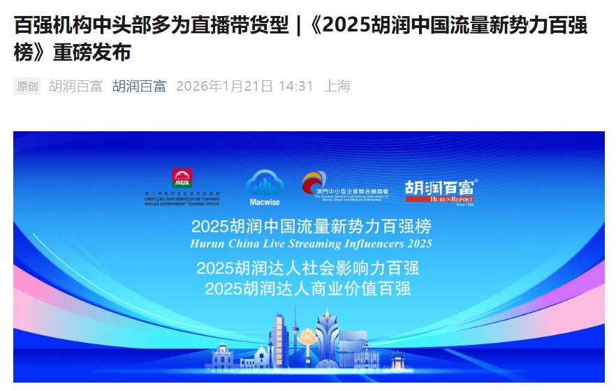 1 月 22 日消息,胡润研究院 1 月 21 日在澳门发布《2025 胡润中国流量新势力百强榜》,榜单列出了中国最具价值的流量新势力机构,这是胡润研究院连续第二次发布该榜单。