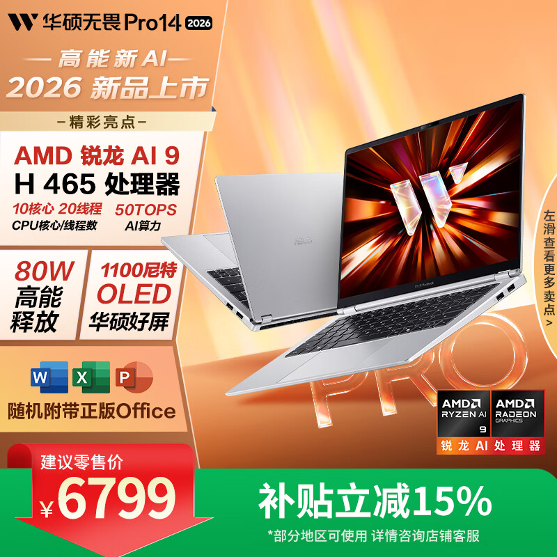 2026 款华硕无畏 Pro 14 / 16 锐龙版笔记本上架:1100 尼特 OLED 屏,AI 9 H465 + 32G + 1T 售 6799 元起锐龙 AI 9 H465无畏 Pro 14无畏 Pro 16华硕无畏 Pro