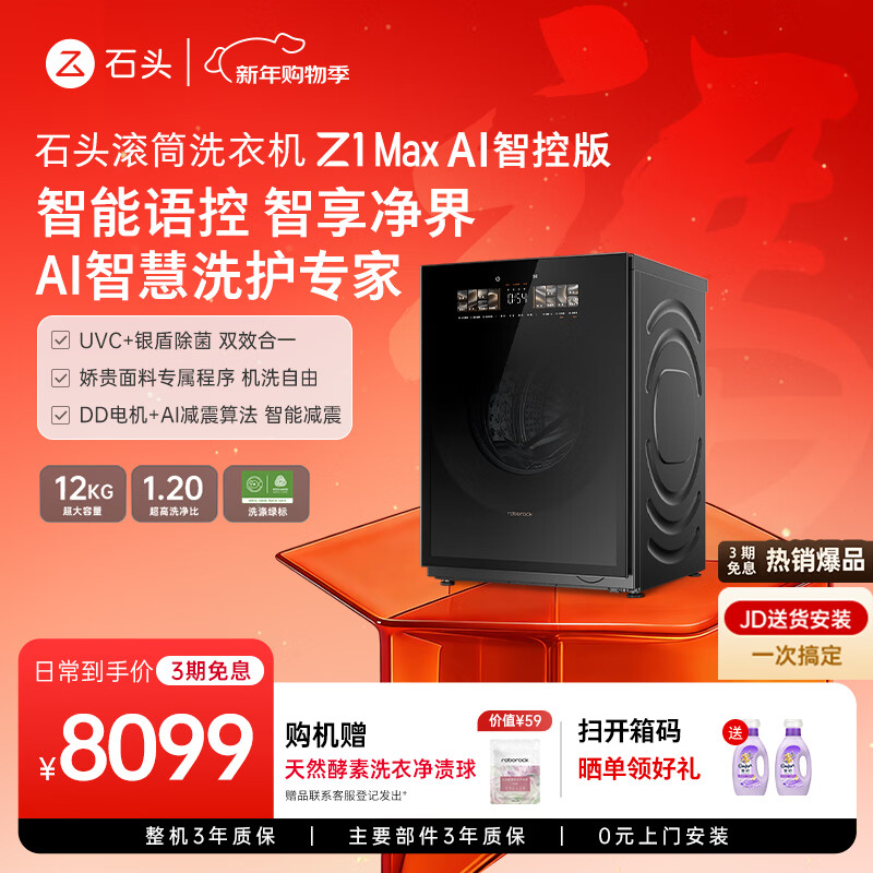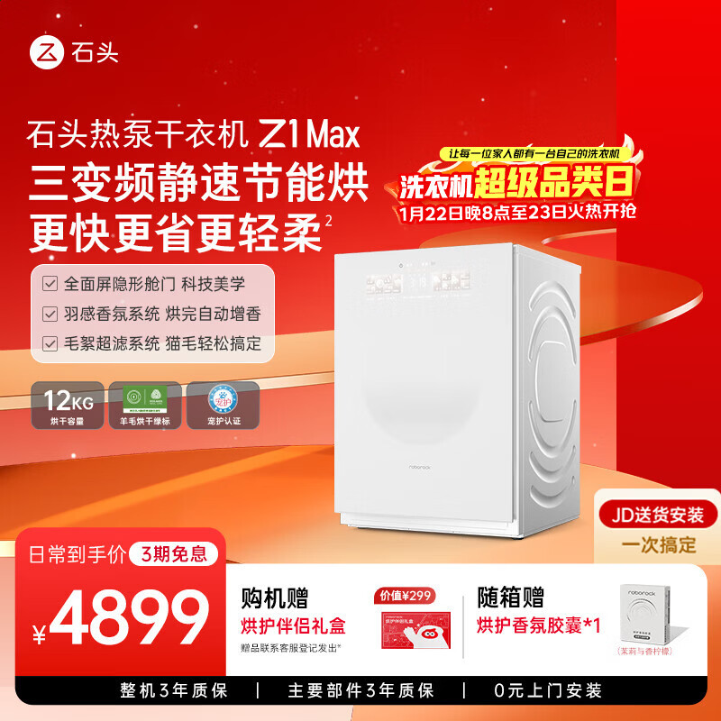 京东石头 滚筒洗衣机 Z1 Max AI 智控版 12kg 以旧换新 4610 元直达链接石头分子筛热泵洗烘套装 Z1 Max Ultra 12kg,定价 14998 元,今日以旧换新 10079.9 元(可选数据线)。