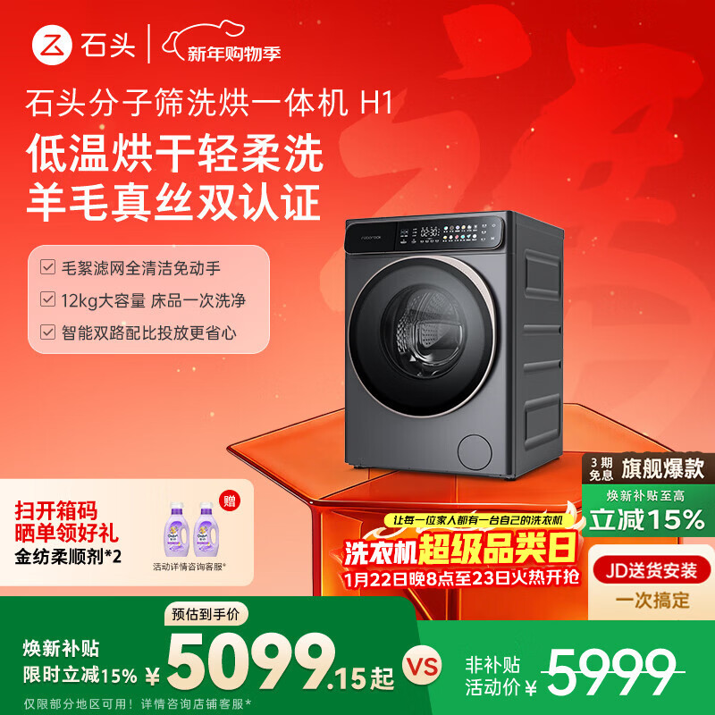 石头分子筛洗烘一体机 H1 12kg,定价 5999 元,今日以旧换新 3442 元(可选数据线)。