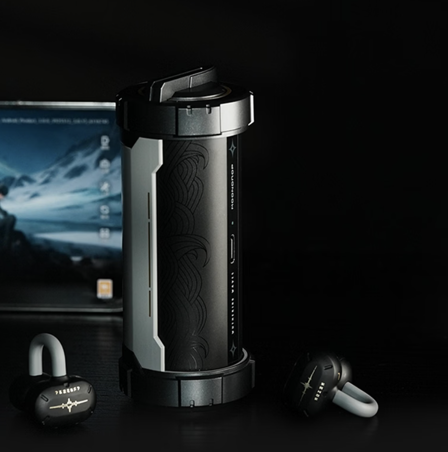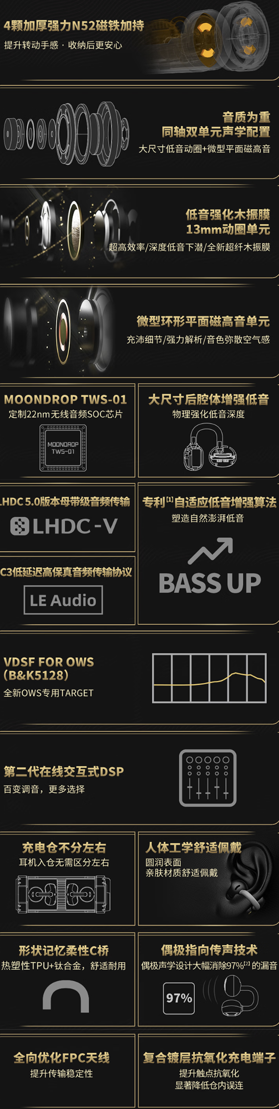 该机配备 13mm 超纤木振膜动圈单元 + 微型平面磁高音单元,采用水月雨定制 22nm 芯片,支持 LHDC 5.0 及 LC3 协议传输、55ms 游戏模式,同时耳机内置联动专属提示音,支持水月雨 App 调参。