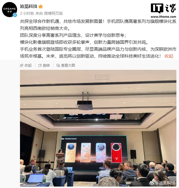 1 月 23 日消息,追觅科技今日在官方微博发文称,手机团队携高奢系列与旗舰模块化系列亮相西南欧经销商大会。