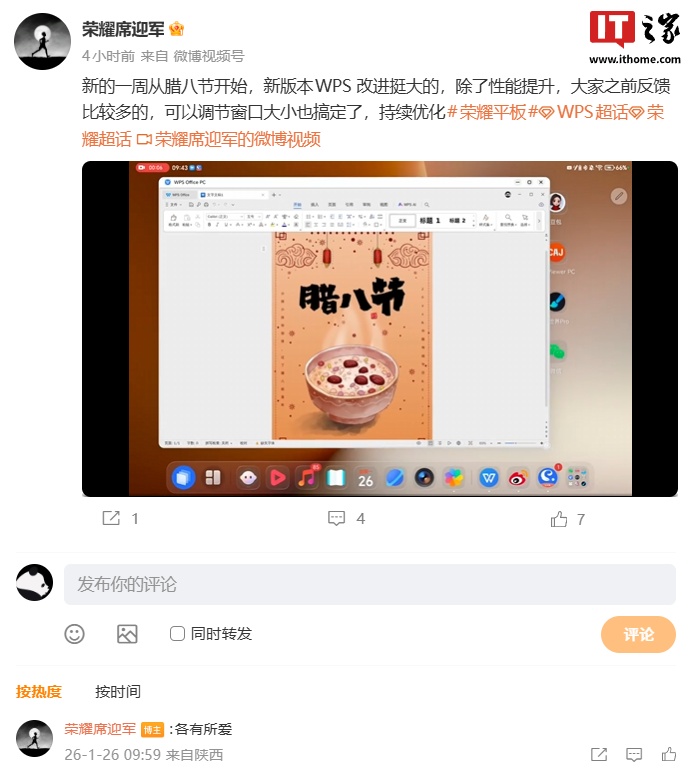 1 月 26 日消息,据荣耀全场景软件主理人 @荣耀席迎军 今日分享,除了性能提升外,荣耀平板的 PC 级 WPS 也迎来大改进。他表示,用户之前反馈比较多的可以调节窗口大小已搞定,后续还会持续优化。