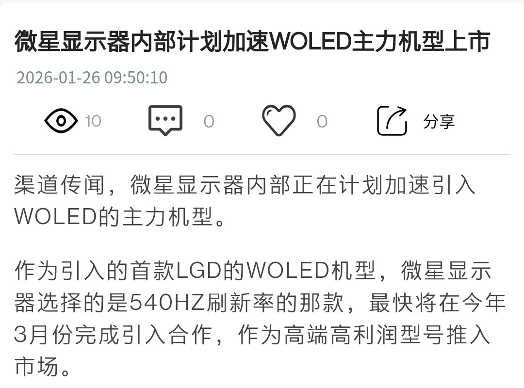 消息源指出,微星的首款 WOLED 显示器将采用 540Hz 面板(注:完整规格应为 26.5" QHD@540Hz / HD@720Hz,这款面板已被多家厂商的旗舰 OLED 显示器采用),最快将在今年 3 月完成引入合作,作为高端高利润型号推入市场。