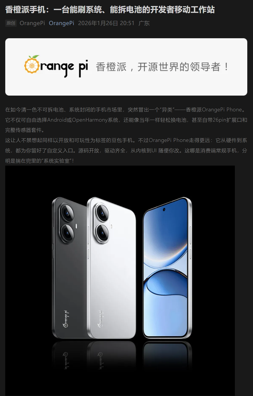 1 月 26 日消息,香橙派官方今天在公众号平台发文,预热一款能够换电池、自带 26pin 扩展接口的 OrangePi Phone 概念手机。