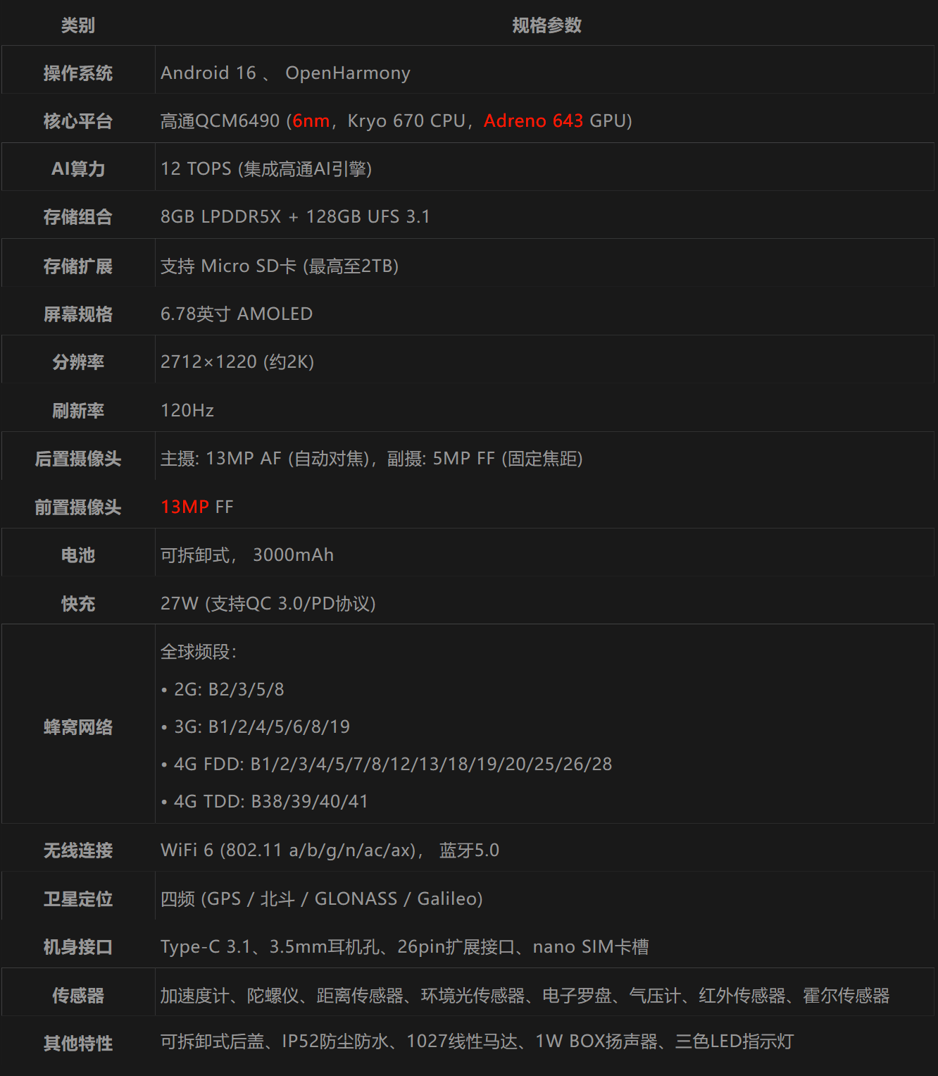 同时这台手机还带有霍尔、地磁、陀螺仪、光线、距离、红外、气压等传感器,支持 2G/3G/4G 全球频段,配备 3000mAh 电池,支持 27W 快充,可以直接拆卸。软件则主打开放性,原生搭载 ,开放完整内核代码与驱动支持,可一键刷入 OpenHarmony 开源。