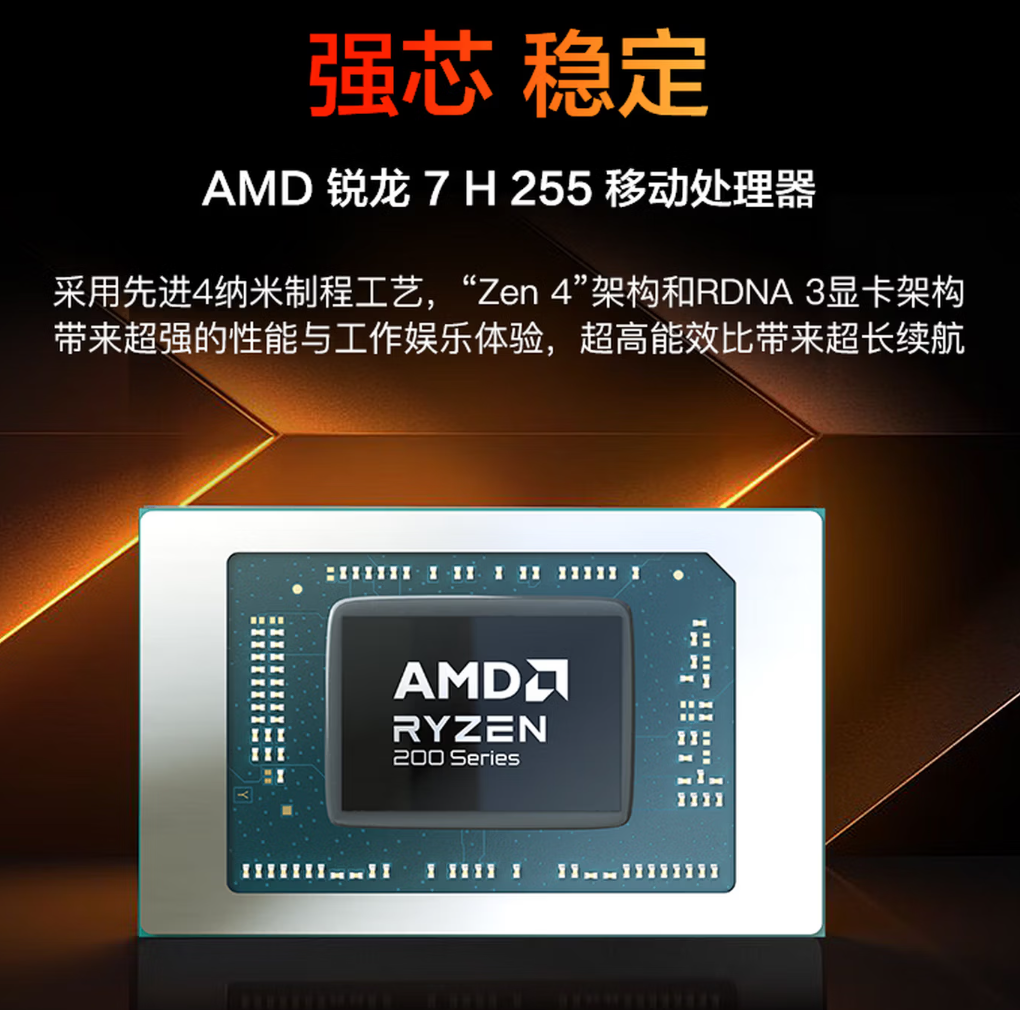 这款笔记本搭载 AMD 锐龙 R7 H 255 移动处理器,采用 8 核心 16 线程架构,最高主频可达 4.9GHz,拥有 Radeon 780M 核显,机身为全金属材质,重量 1.45kg,支持 178° 开合,采用并联双热管、双风扇散热结构,可保证长时间稳定运行。