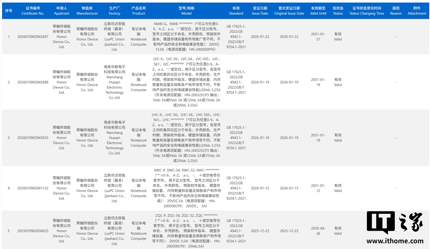 查询 3C 认证发现,荣耀终端股份有限公司申请的多款笔记本电脑于 2025 年 12 月和 2026 年 1 月通过认证,分别配有 65W、100W、260W 电源适配器。