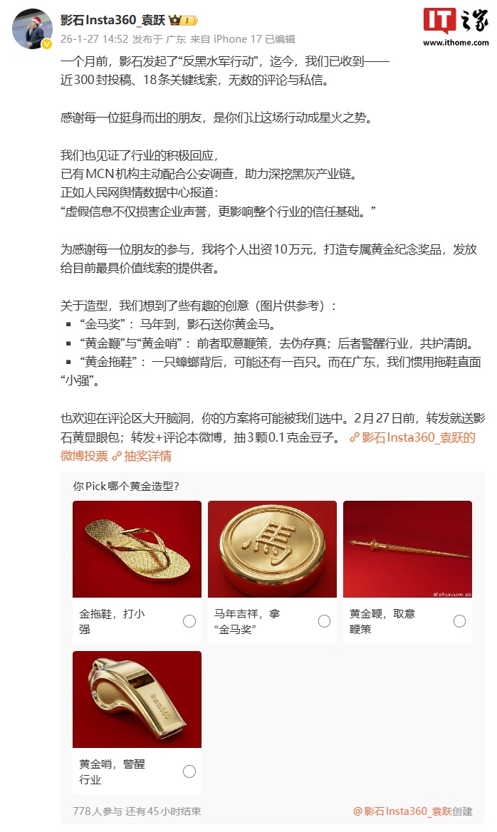 注意到,影石中国区负责人袁跃也发文宣布,将个人出资 10 万元,打造专属黄金纪念奖品,发放给目前最具价值线索的提供者。目前纪念品造型创意包括:金拖鞋、“金马奖”、黄金鞭、黄金哨。