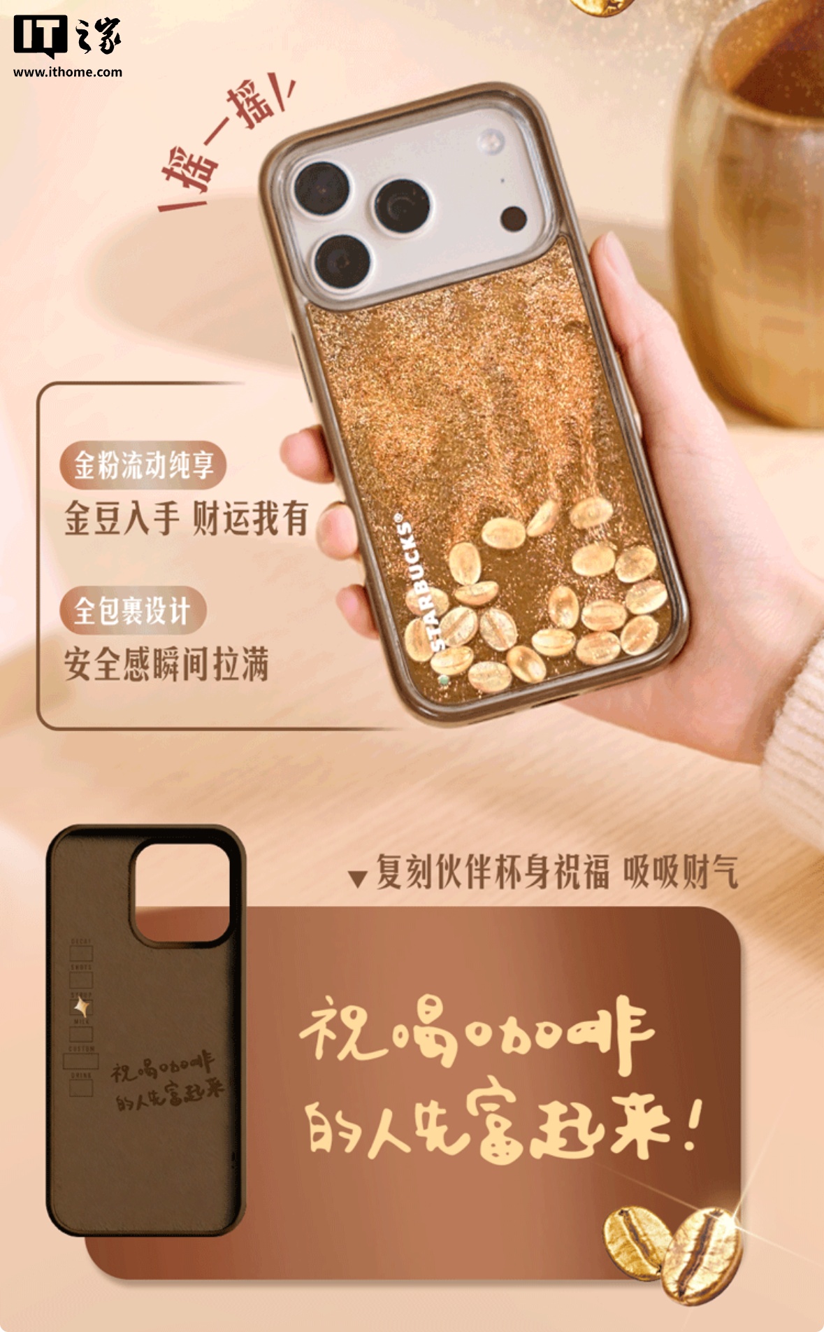 官方主打一款“闪闪豆子款”设计,该手机壳适用于苹果 iPhone 14/15/16/17 全系机型(含 )及华为 Mate 70/Pro 手机,采用透明外壳包裹金粉流动层,底部内置仿真咖啡豆造型装饰。摇晃时,金粉与咖啡豆随之流动,可呈现趣味视觉效果。