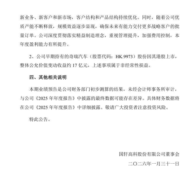 1 月 30 日消息,国轩高科今日公告,预计 2025 年度净利润为 25 亿元-30 亿元,同比增长 107.16%-148.59%。