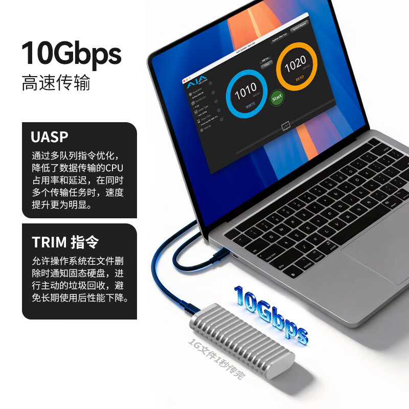 其采用 USB3.2 Gen2 标准,理论提供 10Gbps 传输带宽,实测读速约 1020MB/s,写速 1010MB/s,1GB 大小文件约 1 秒传输完成。