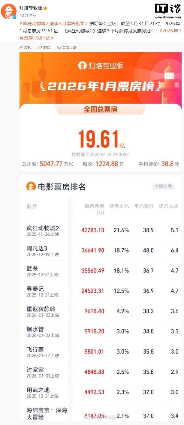 1 月 31 日消息,据灯塔专业版数据,截至 1 月 31 日 21 时,2026 年 1 月全国总票房 19.61 亿,《疯狂动物城 2》连续 3 个月获得月度票房冠军,国内累计票房已达 44.44 亿元。