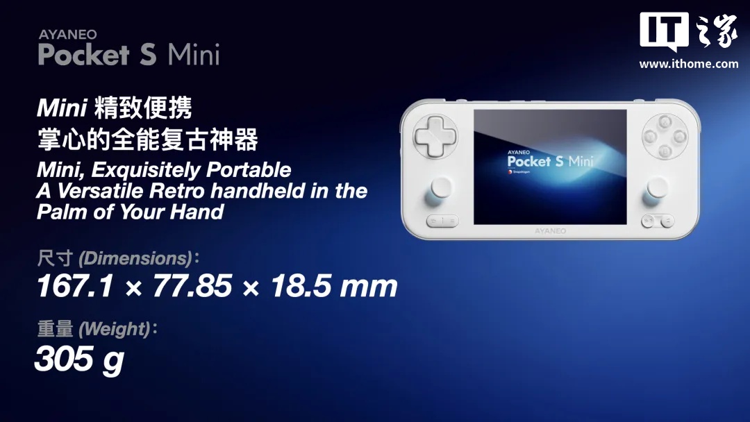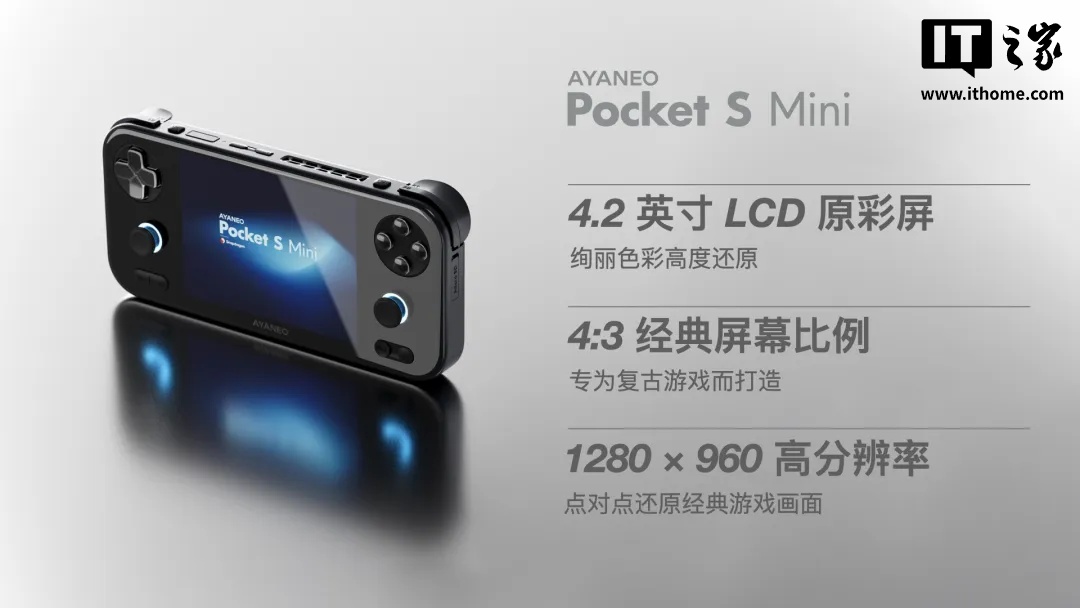 2 月 1 日消息,AYANEO Pocket S Mini 复古游戏机已正式发布,该机搭载第二代骁龙 G3x 游戏平台、配备 4:3 超高清 LCD 屏,号称“真 4:3 复古游戏毕业机”,首发价 2299 元起。