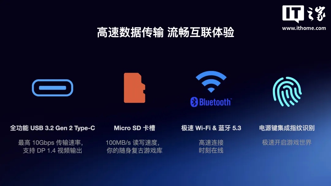 注意到,AYANEO Pocket S Mini 掌机还内置 6000mAh 电池,支持 PD 快充,并提供立体声双扬声器、全功能 USB 3.2 Gen 2 Type-C 接口、Micro SD 卡槽、高速 Wi-Fi 与蓝牙 5.3,以及集成指纹识别的电源键等。