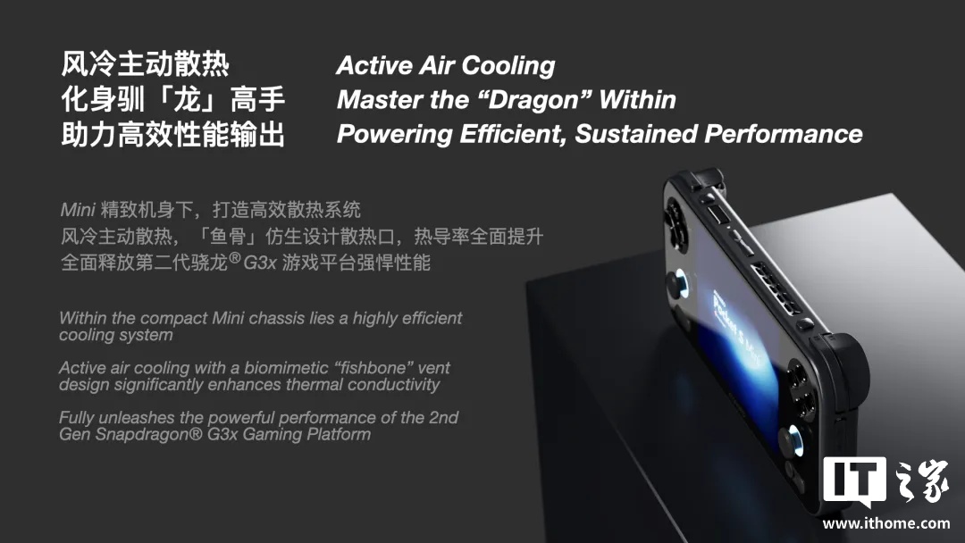 该掌机搭载第二代骁龙 G3x 游戏平台,基于 4nm 制程工艺打造,配备 8 核 Kryo CPU 与 Adreno A32 GPU,可运行经典复古游戏、当下流行的热门手游等。掌机还在内部结构中引入了风冷主动散热系统,通过「鱼骨」仿生设计的散热口与高效风道布局,在长时间高负载运行下也能保持稳定温度。