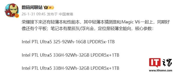 2 月 1 日消息,博主 @数码闲聊站 公布了三款荣耀笔记本电脑新品的核心配置。博主猜测,2026 款荣耀 MagicBook(Pro)轻薄本新品将与下一代折叠屏旗舰手机 Magic V6 同期发布(今年 3 月),届时可能还有新款 MagicPad 平板电脑亮相。