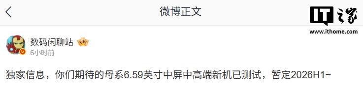 2 月 2 日消息,博主 @数码闲聊站 今日爆料称,某厂母系 6.59 英寸中屏中高端新机已测试,暂定 2026H1。