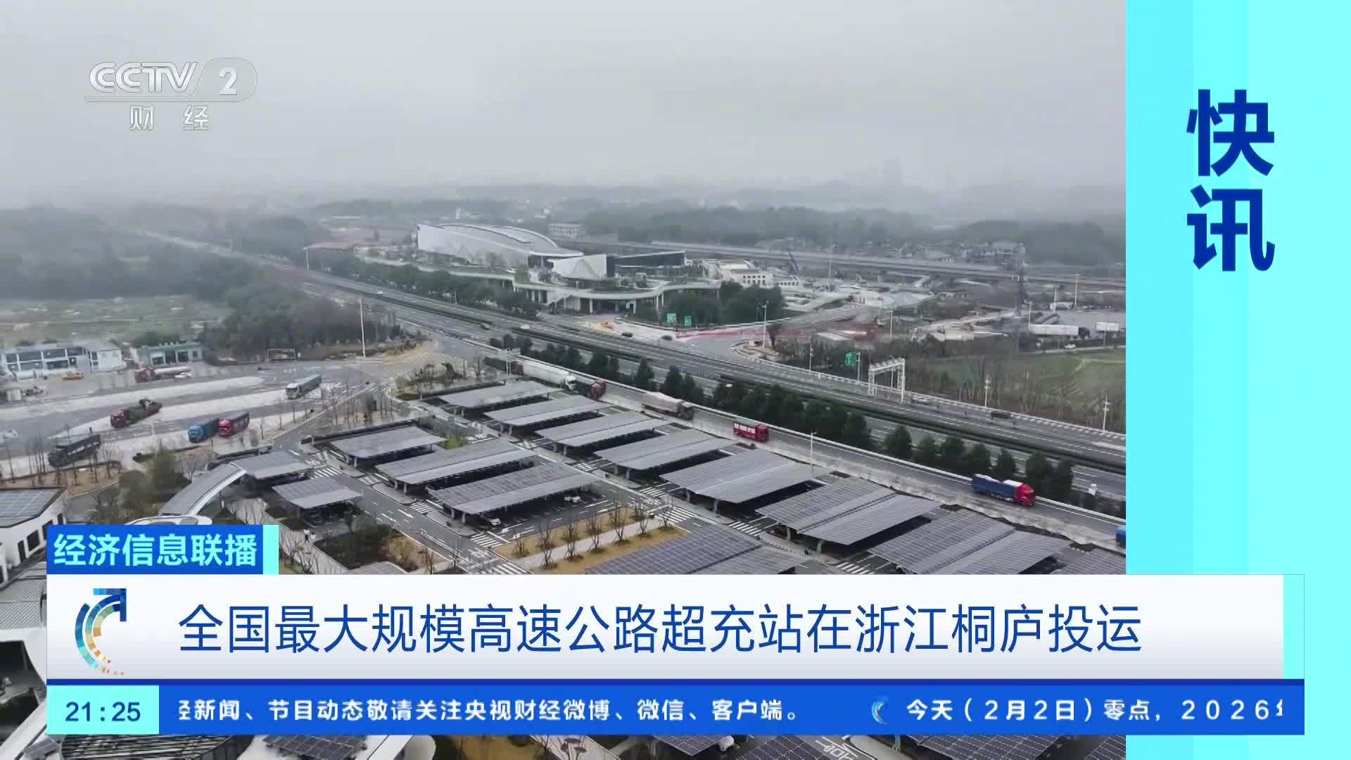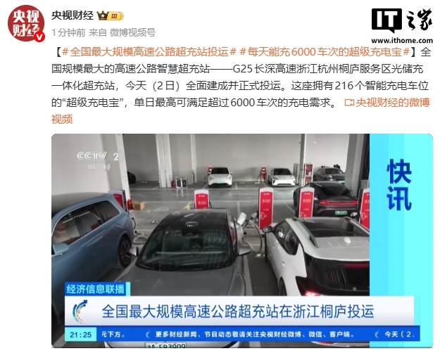 2 月 2 日消息,据央视财经报道,全国规模最大的高速公路智慧超充站 ——G25 长深高速浙江杭州桐庐服务区光储充一体化超充站,今天全面建成并正式投运。这座拥有 216 个智能充电车位的“超级充电宝”,单日最高可满足超过 6000 车次的充电需求。