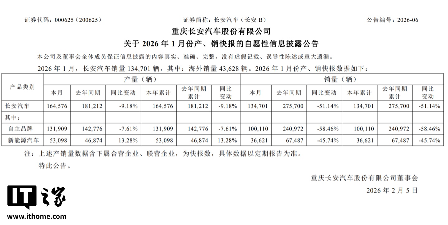 2 月 4 日消息,长安汽车发布公告,2026 年 1 月产量 164,576 辆,同比下降 9.18%;销量 134,701 辆,其中海外销量 43628 辆,同比下降 51.14%。